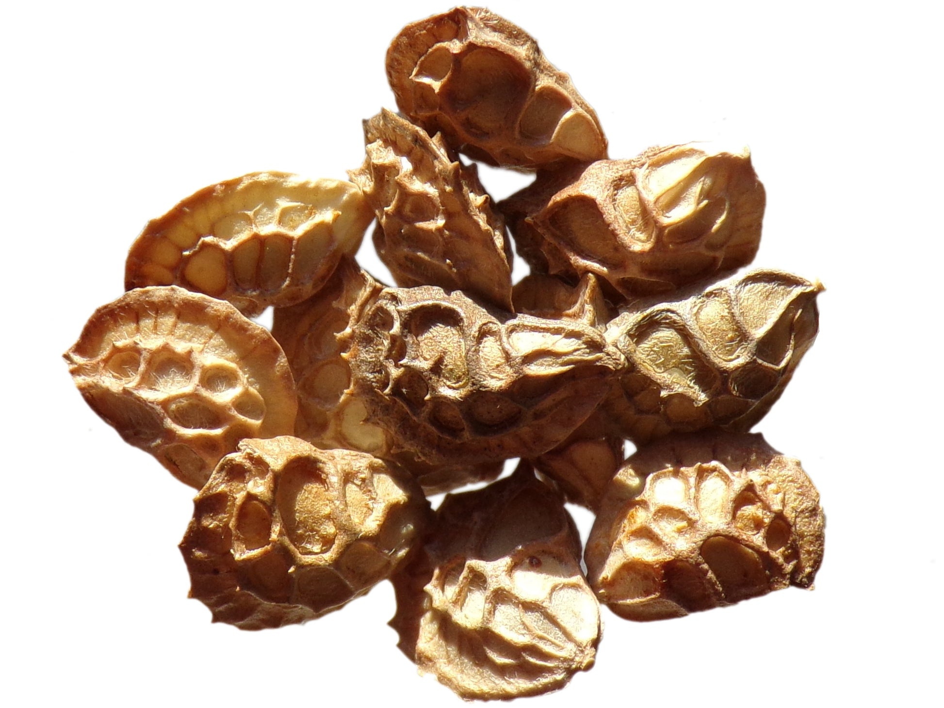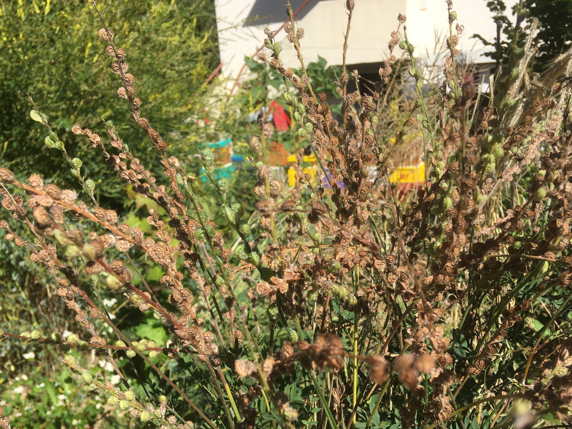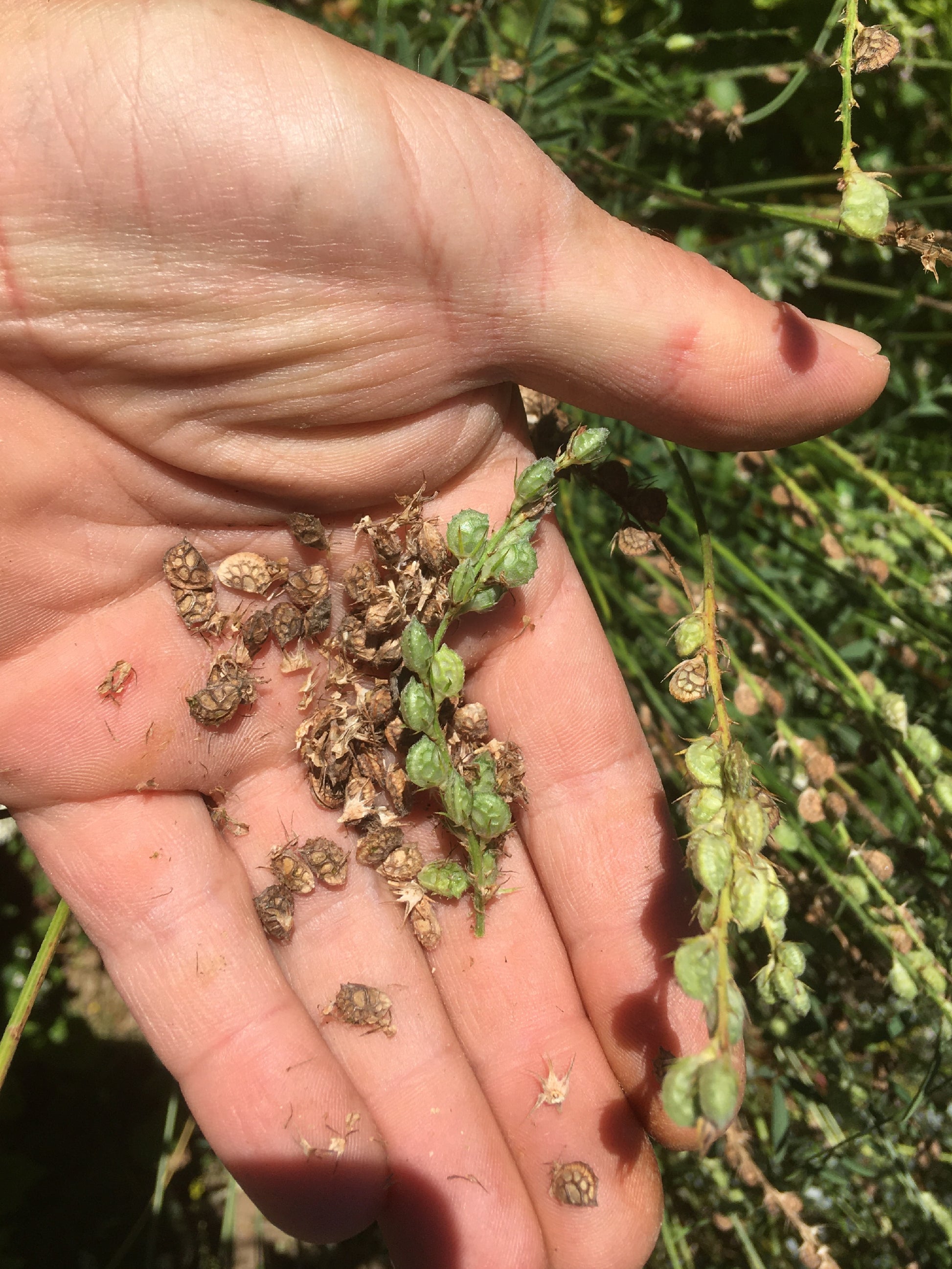 Les fruits sont des petites gousses dentées, chaque fleur donne une graine, enfermée dans une gaine.