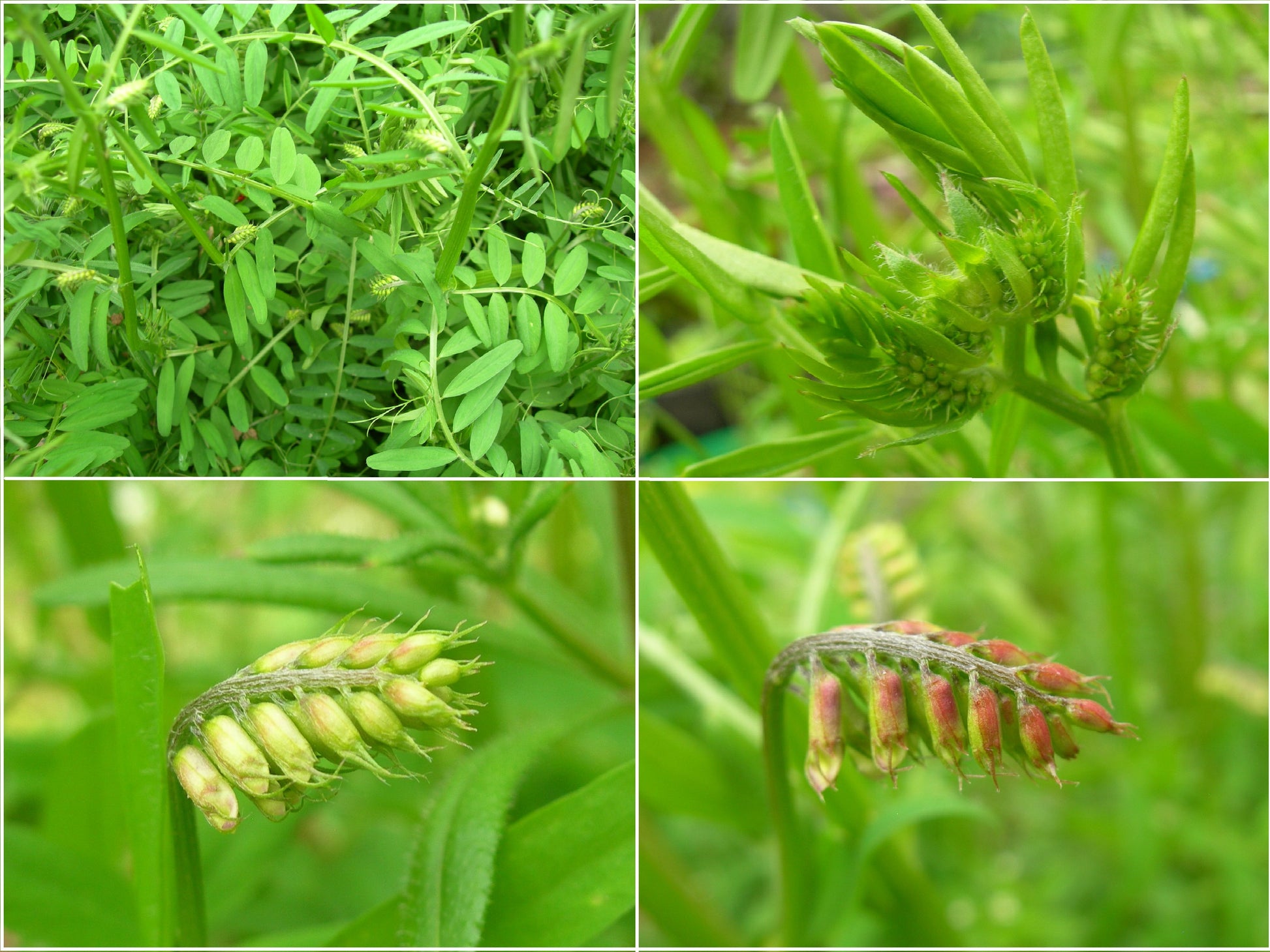 En culture pure, son port lianaissant fait qu’elle s’affaisse et ne dépasse pas 80 cm à 1 m de haut, tiges non lignifiées, elles peuvent faire jusqu’à 4 m de long. Ses feuilles sont vert tendre à vert foncé. Elles sont composées de 9 à 17 paires de folioles ovales, opposées. Elles se terminent par des vrilles de 2 à 3 branches, qui lui permettent de grimper sur tout support et qui font que les plants s’enchevêtrent.